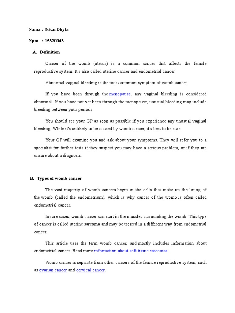 A hysterectomy is an operation to remove the uterus (womb). The doctor also may order lab tests, imaging tests (scans), or other tests or procedures. This is why it is so crucial to be familiar with the signs of womb cancer. If cancer is found, it must be treated as soon as possible with an operation to remove the womb (hysterectomy). The bleeding may start as a light bleed with a watery discharge, which may get.